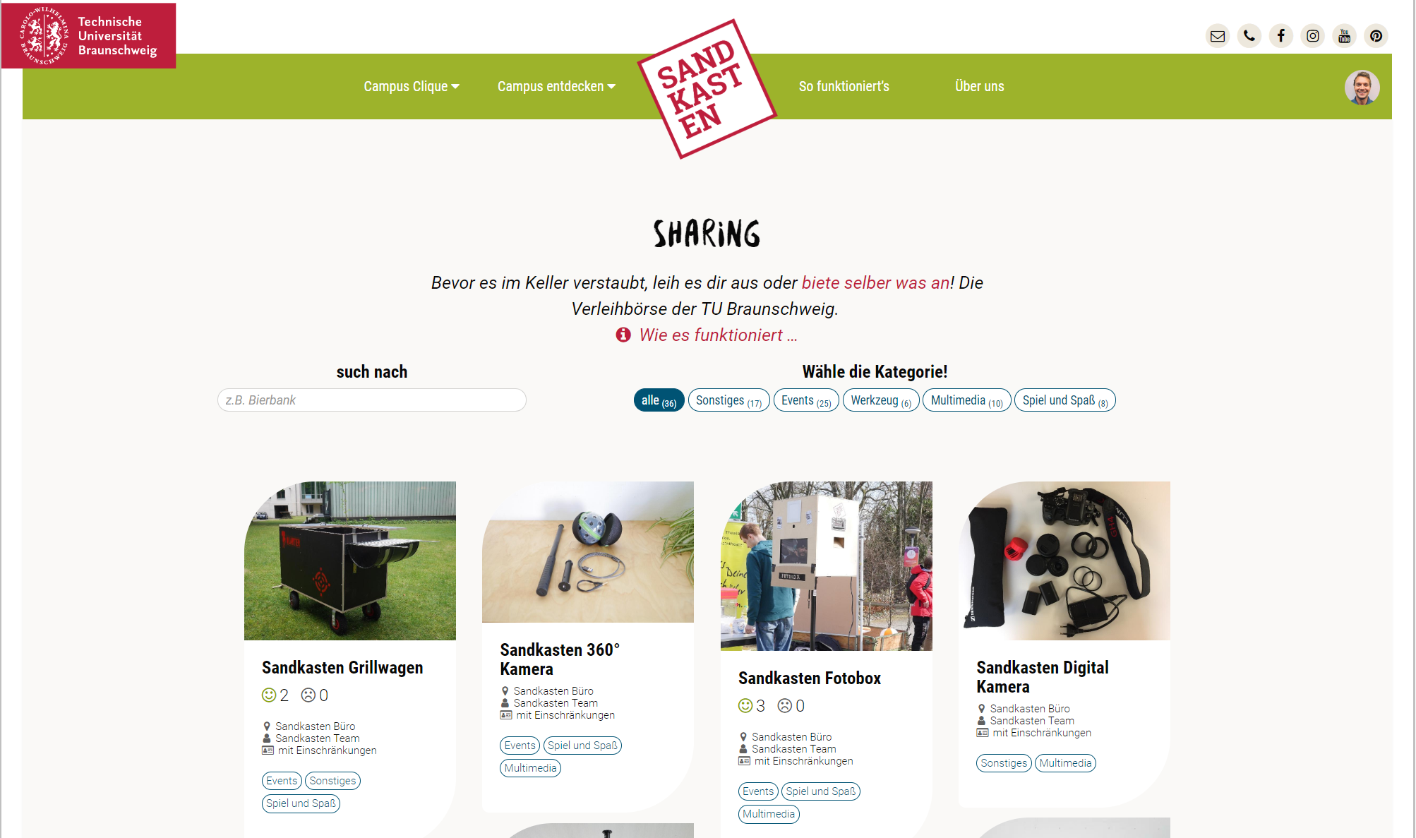 Das Sharing-Modul auf der Sandkasten-Plattform ist eigentlich ganz einfach. Es dient als digitales schwarzes Brett, auf dem ihr nach Verleihgegenständen suchen könnt oder eure Gegenstände zur Verfügung stellen könnt.
