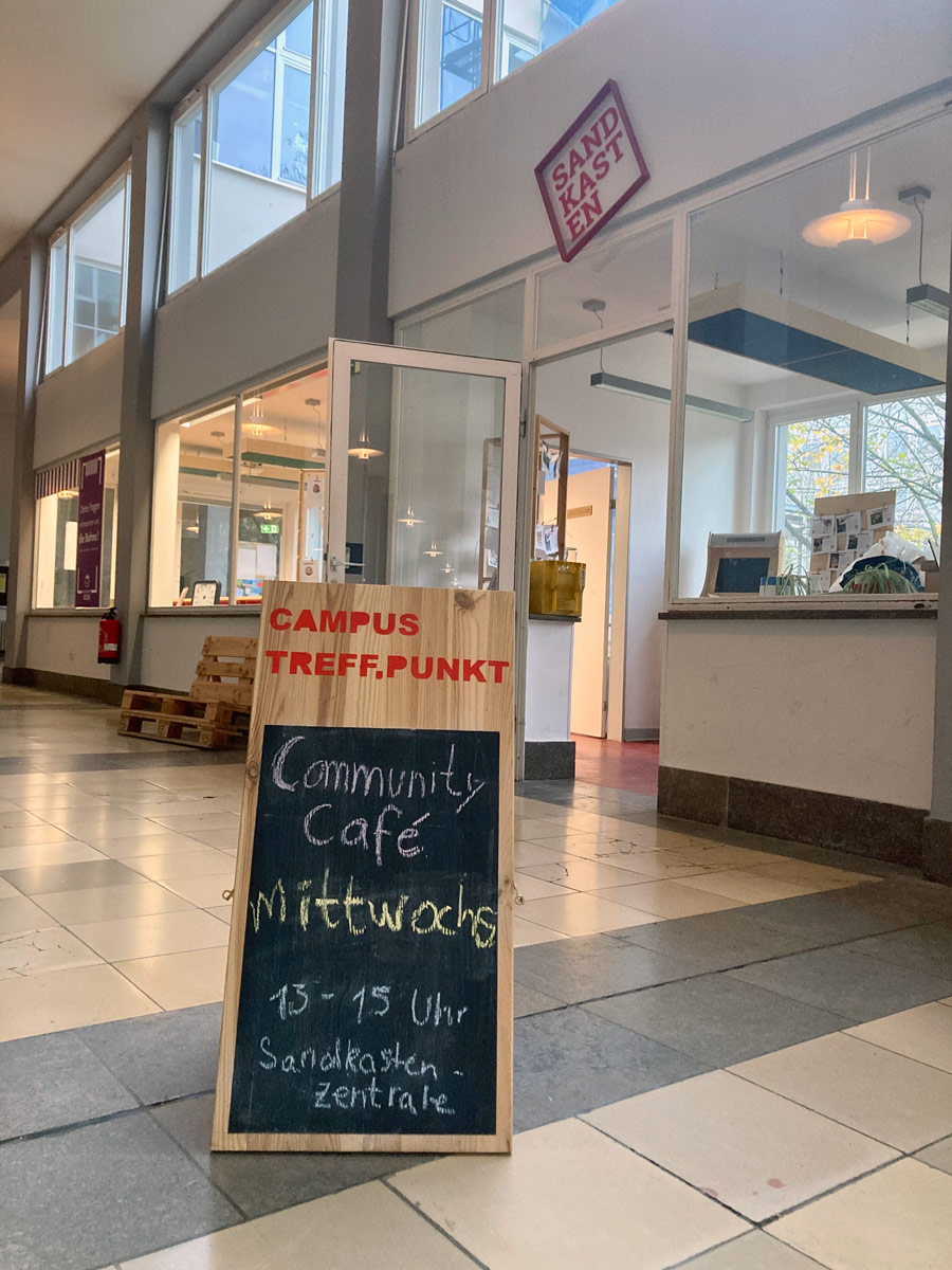 Seit Oktober findet wöchentllich das Community-Café in der Sandkasten-Zentrale statt. Dort wird sich bei Kaffee zu verschiedenen Themen und Sandkasten im Allgemeinen ausgetauscht. Alle Menschen auf dem Campus sind herzlich Willkommen.