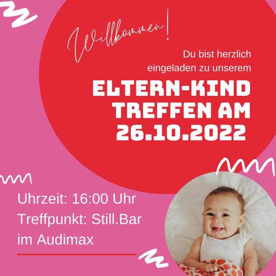 Du bist herzlich eingeladen zu unserem Eltern-Kind-Treffen, was erstmals in der neuen Still.Bar im Audimax stattfindet!
