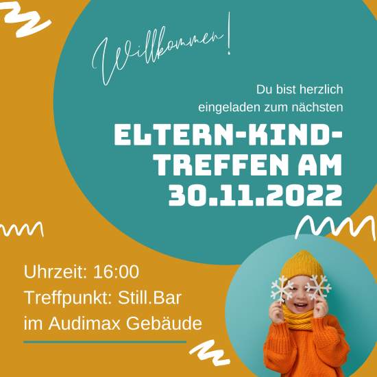 Das nächste (und für dieses Jahr vorerst letzte) Eltern-Kind-Treffen vom Familienbüro findet am Mittwoch, den 30.11.2022 in der Still.Bar im Audimax Gebäude statt!