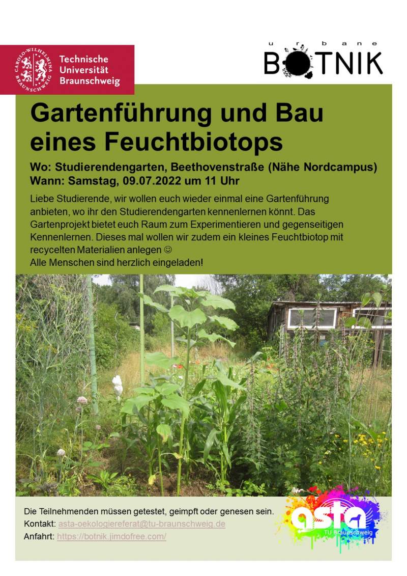 Liebe Studierende, wir wollen euch wieder einmal eine Gartenführung anbieten, wo ihr den Studierendengarten kennenlernen könnt. Das Gartenprojekt bietet euch Raum zum Experimentieren und gegenseitigen Kennenlernen. Dieses mal wollen wir zudem ein kleines Feuchtbiotop mit recycelten Materialien anlegen :) Alle Menschen sind herzlich eingeladen!