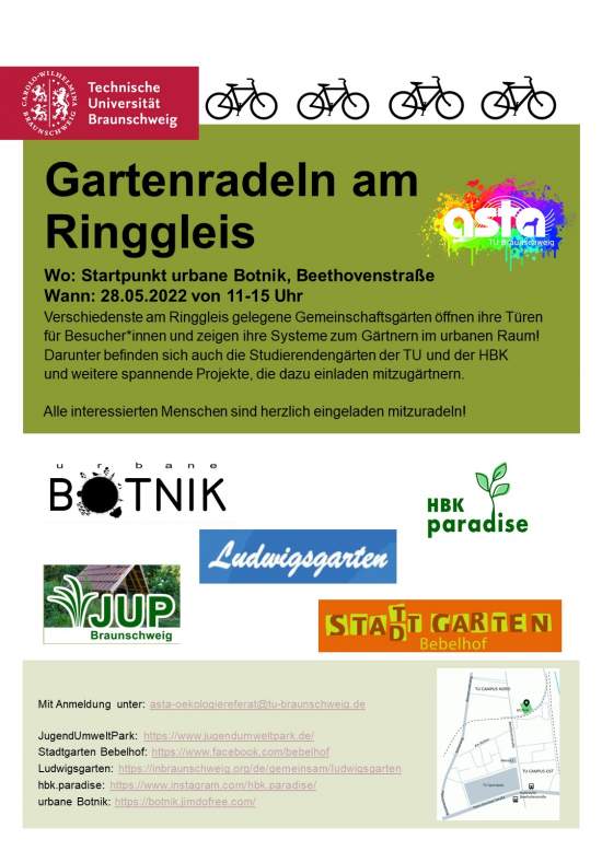 Verschiedenste am Ringgleis gelegene Gemeinschaftsgärten öffnen ihre Türen für Besucher*innen und zeigen ihre Systeme zum Gärtnern im urbanen Raum! Darunter befinden sich auch die Studierendengärten der TU und der HBK und weitere spannende Projekte, die dazu einladen mitzugärtnern.