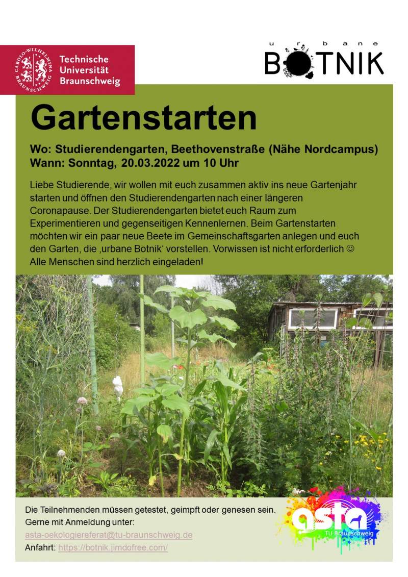 Liebe Studierende, wir wollen mit euch zusammen aktiv ins neue Gartenjahr starten und öffnen den Studierendengarten nach einer längeren Coronapause. Der Studierendengarten bietet euch Raum zum Experimentieren und gegenseitigen Kennenlernen. Beim Gartenstarten möchten wir ein paar neue Beete im Gemeinschaftsgarten anlegen und euch den Garten, die ‚urbane Botnik‘ vorstellen. Vorwissen ist nicht erforderlich :) Alle Menschen sind herzlich eingeladen!