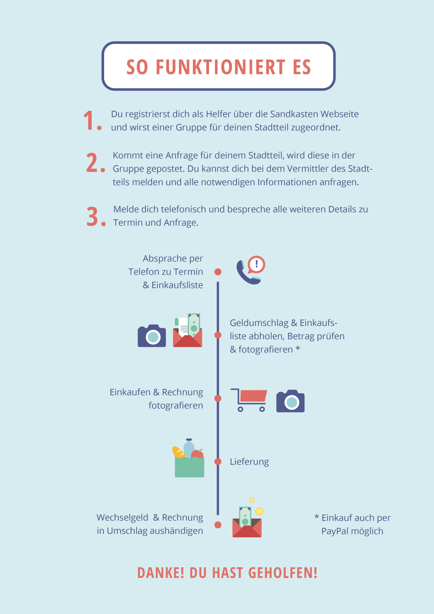 Wir unterstützen Sie ehrenamtlich. Sie zahlen Ihren Einkauf und sonst keine weiteren Gebühren. Werfen Sie einen Blick auf das obige Ablaufdiagramm oder rufen Sie uns gerne an.