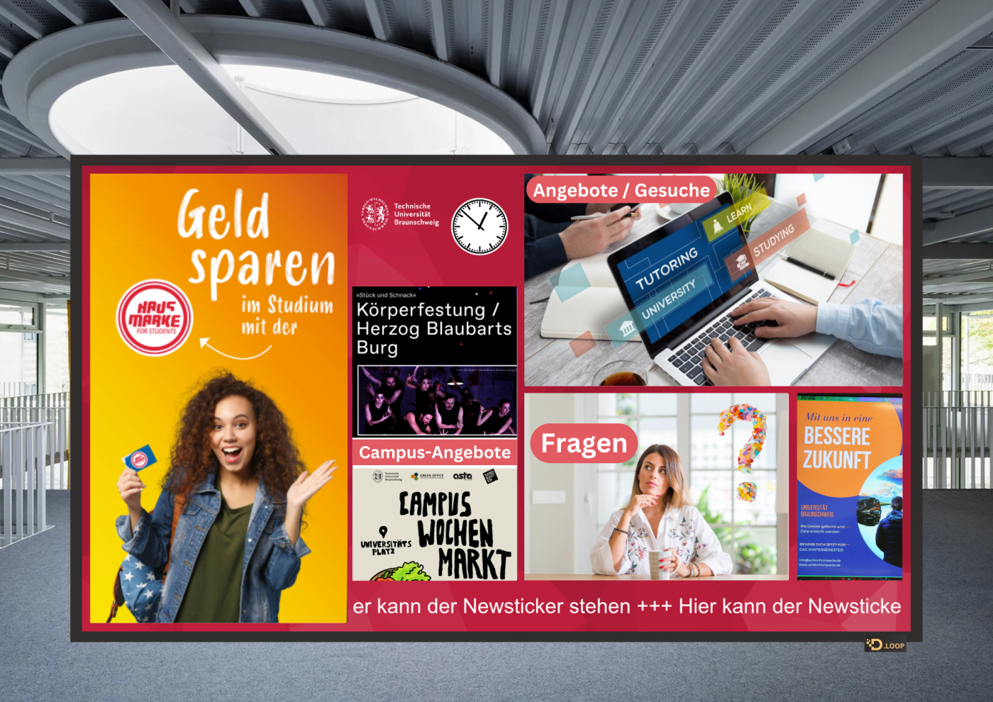 Im Neuen Studierendenhaus sollen digitale Pinnwände installieren werden. Dieser zentrale Ort bietet eine hohe Sichtbarkeit und Zugänglichkeit für alle Studierenden und Mitarbeiter der Universität.