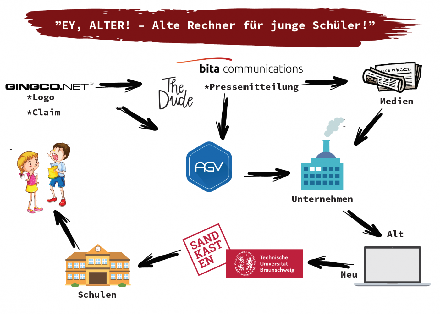 Bei dem Projekt Hey, Alter! Alte Rechner für junge Leute sollen Rechner, die bei Firmen oder auch Privatpersonen übrig sind, SchülerInnen aus einkunftsschwachen Familien zur Verfügung gestellt werden. So helfen wir dabei, dass möglichst alle jungen Menschen in der Region auch an der digitalen Schule teilhaben können. Das Projekt wurde initiiert von Moritz Tetzlaff (TrafoHub) und Martin Bretschneider (Ginco), schnell waren viele Partner und Institutionen mit an Board: Die Landesschulbehörde sowie Elternvereinigungen und soziale Einrichtungen unterstützen bei der Ermittlung von konkreten Bedarfen, der Arbeitgeberverband Region Braunschweig bei der Akquise von Laptops bei Firmen, die Firma "ATD bei der Logistik und der Löschung von Geräten. Die Annahme sowie Aufbereitung der Geräte dürfen wir in den Räumlichkeiten der TU machen.