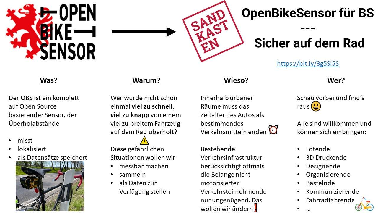(Juli 2021) Wir konnten das entsprechende Interesse aus der Studierendenschaft sammeln, sodass der OpenBikeSensor für Braunscheig von Sandkasten unterstützt wird <3