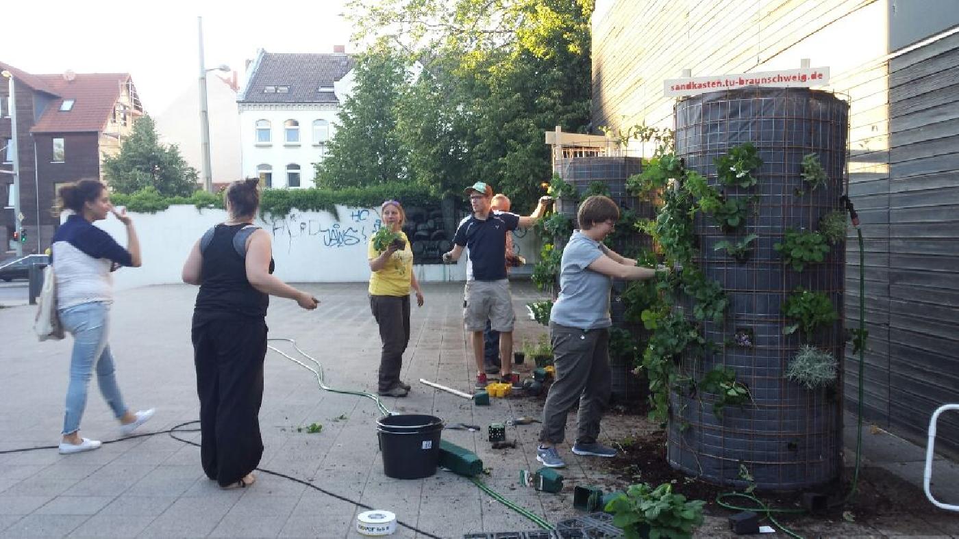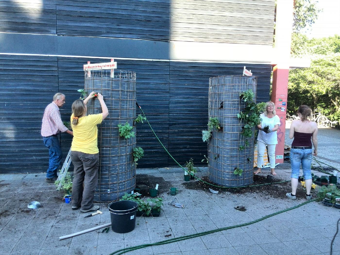 Gemeinsam mit dem Künstler Reiner Bergmann und vielen Freiwilligen wurden im Sommersemester 2015 vor der Mensa-Katharinenstraße Pflanzensäulen – auch bekannt als Vertikalgärten – gebaut. Wenn zur Erntezeit etwas reif ist, könnt ihr euch gern bedienen! Eine frische Erdbeere oder etwas Basilikum schaden selten. Ein großer Dank geht an den AStA für die tägliche Wasserspende und das Institut für urbane Botnik für die Vorzucht einiger Pflanzen. Gegenwärtig sind die Säulen leider etwas in Mitleidenschaft gezogen. Gesucht sind motivierte Anpacker_Innen! Meldet euch gern bei der Projektleitung :-).