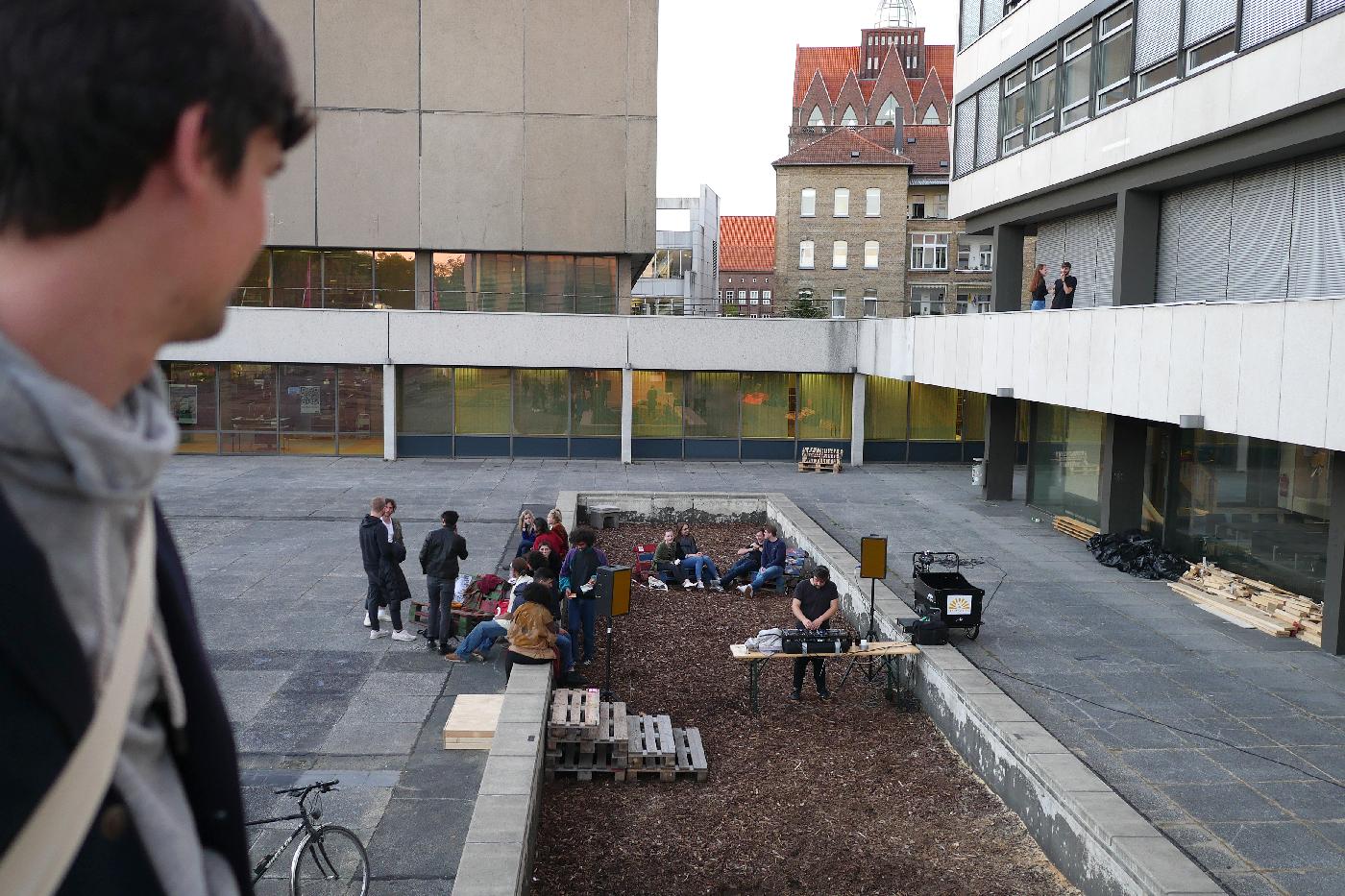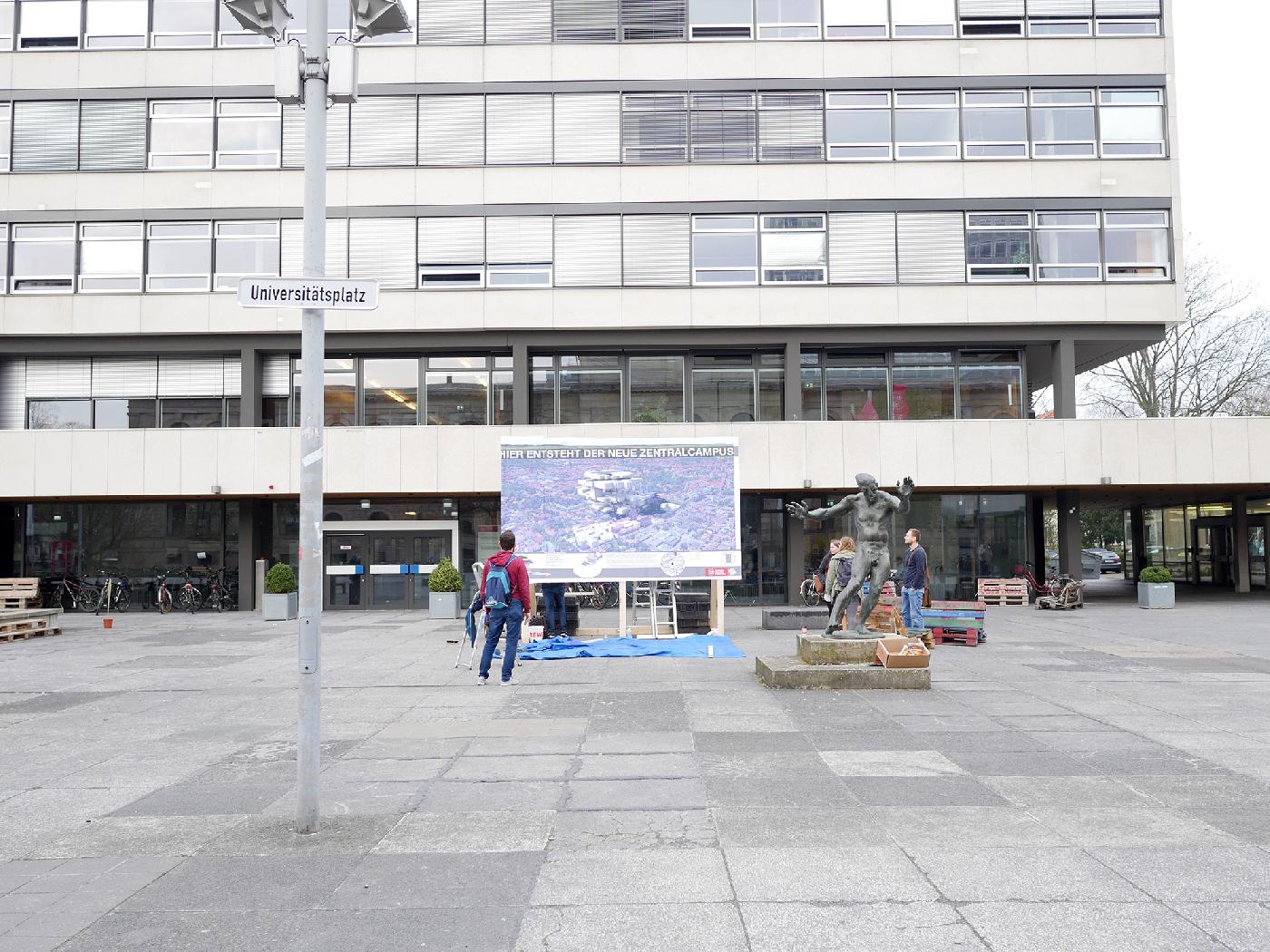 In dem Seminar „Platz“ wurden temporäre künstlerische Arbeiten für den Hauptcampus entwickelt. Dabei wurden vor allem der Universitätsplatz und der stillgelegte Brunnen vor dem Präsidiumsgebäude als Raum untersucht und neu belebt.
