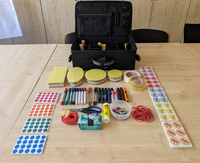 - Schere, Kleber, Tesafilm, Kreide, Pinnnadeln, Gummibänder, Kreppband