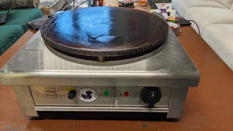 Unser leistungsstarkes Industrie-Crêpe-Eisen steht samt Zubehör zur Ausleihe bereit – ideal für größere Veranstaltungen.